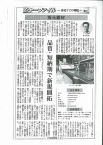 業界紙「産業新聞」に記事を掲載していただきました。 シャーリング溶断業の各企業を取り上げる連載記事「シャーファイル」。 弊社の創業からの歴史を振り返り、レーザー導入から経営改革を進める現在までの様子を概観していただきまし […]